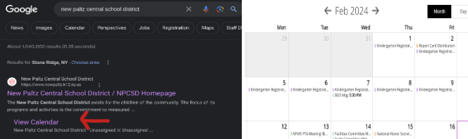 Hay 2 formas en como buscar el calendario, la primera forma empieza en un buscador como Google, Safari, Chrome etc. Puedes escribir “New Paltz Central School district” y aparecerá un opción que dice “view calendar”, ahora podrás ver el calendario actual.