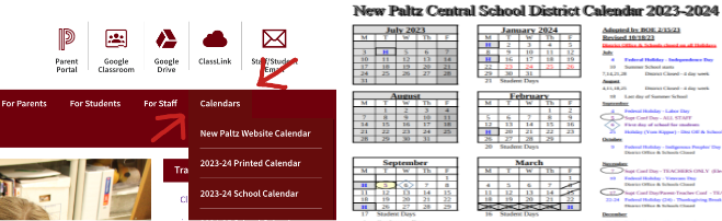 También se puede por buscar el calendario anual de todas las escuelas dentro el distrito por entrar al sitio del distrito ( https://www.newpaltz.k12.ny.us/ ), entrando al sitio puedes ir al sección “calenders” y encuentras el calendario del año escolar actual. Cuando haces clic al área de calendario puedes escoger el calendario del año escolar actual que tu quieras. Cuando haces esto, puedes ver el calendario y ahora ya puedes ver los días importantes.