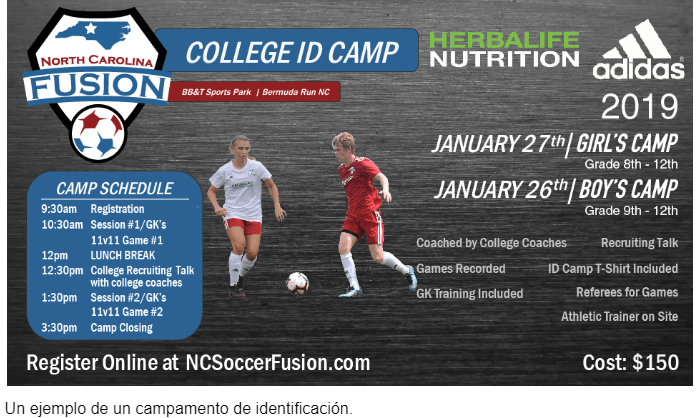 Los campamentos de identificación ofrecen numerosos beneficios para tu hijo. A través de asistir a un campo acampar, tu hijo puede encontrarse con el entrenador, ver el campus, y entrenar con muchos jugadores de alto nivel. Los campamentos de identificación son especialmente beneficiosos para mostrar su interés en la escuela porque todos los atletas en el campamento están interesados en la escuela.